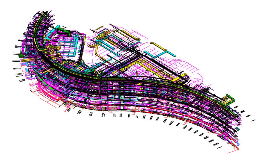 其中BIM機電深化設(shè)計為項目帶來了巨大的經(jīng)濟效益。通過建立BIM模型,在模型中進行管線綜合排布、凈高優(yōu)化、機房深化設(shè)計等,發(fā)現(xiàn)并解決設(shè)計圖紙中存在的錯誤,然后進行碰撞檢查,優(yōu)化管線走向,提高樓層凈高,最終導(dǎo)出深化后的BIM模型與CAD圖紙,兩者相結(jié)合對現(xiàn)場施工人員進行交底,指導(dǎo)現(xiàn)場施工。