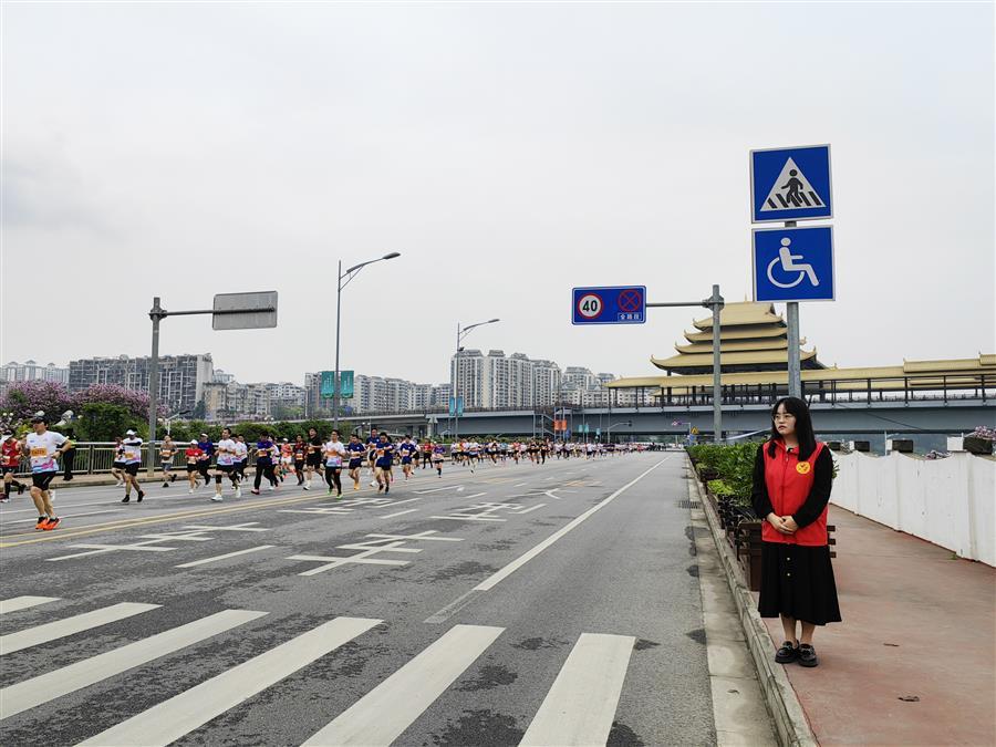 早上五點半,公司志愿者便集合出發(fā)前往執(zhí)勤點。到達(dá)比賽場地后,志愿者們迅速分配任務(wù),有序地在跑道旁一字排開,靜候參賽選手的到來。根據(jù)工作安排,公司志愿者們分別在半程馬拉松9KM和10Km的鳳凰嶺大橋至白沙碼頭路段維護(hù)現(xiàn)場秩序并為參賽者加油助威。他們用青春與汗水,懷著滿腔熱血助力本次馬拉松,成為馬拉松道路上一道亮麗的風(fēng)景線!